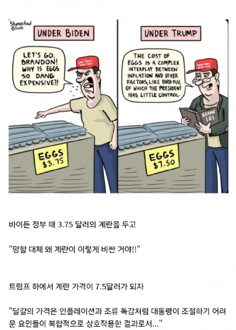최근 미국의 계란 가격이 천정부지로 오르고 있습니다. 바이든 정권하에서는 계란 가격이 무려 3.75달러로 뛰어올랐고, 국민들은 "망할 대체 왜 계란이 이렇게 비싼거야!"라며 분노를 쏟아내고 있습니다. 그 이전, 트럼프 대통령 하에서는 계란 가격이 7.50달러에 달했던 시기가 있었습니다. 트럼프 지지자들은 "달걀의 가격은 인플레이션과 조류 독감 같은 엄청난 요인들이 복합적으로 작용한 결과"라며 대통령의 통제를 벗어난 복잡한 상황을 주장하지만, 과연 그 이유가 모든 것을 설명할 수 있을까요?