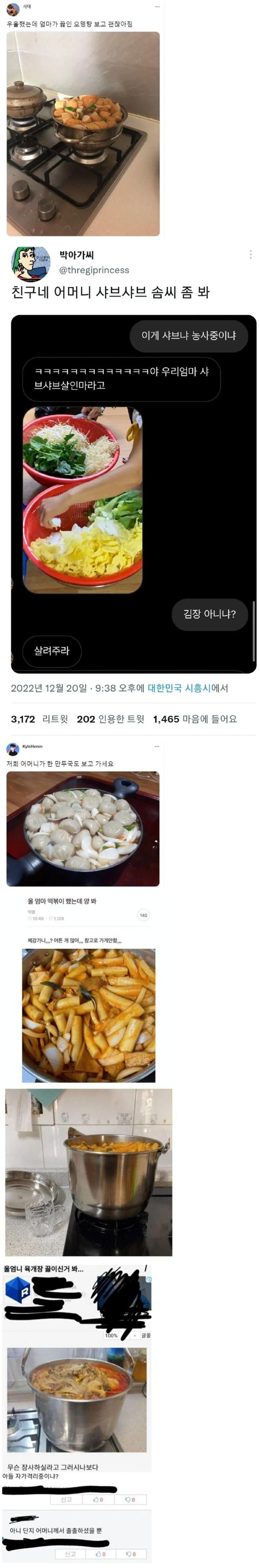 또 다른 사용자는 친구 어머니의 샤브샤브 솜씨를 두고 “이게 샤브냐 농사 중이냐”라고 농담을 덧붙이며 그의 엄마를 ‘샤브샤브 살인마’라고 지칭, 이렇게 대단한 요리실력에 감탄을 금치 못했다. 물론 이는 한편으로 김장으로 오해를 샀다는 주장을 덧붙이며 웃음을 주고 있다.