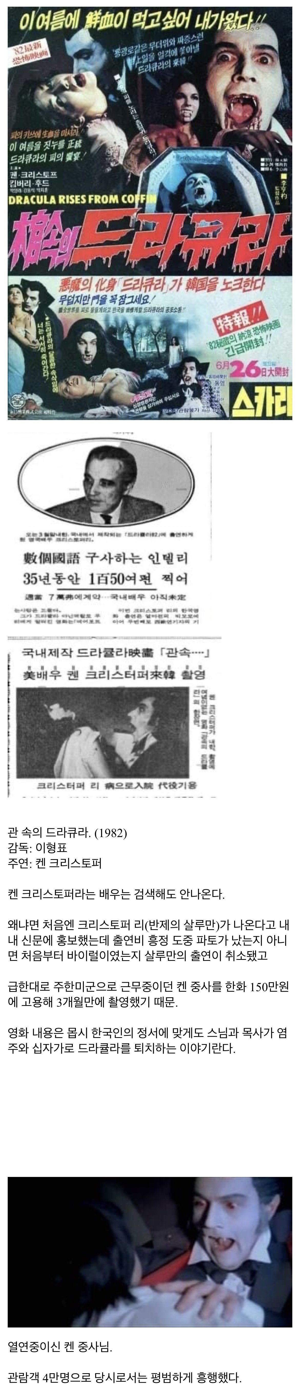 더욱 충격적인 것은 주인공으로 알려진 크리스토퍼 리가 갑작스럽게 하차하면서, 전혀 예상치 못한 인물이 대신 투입되었다는 사실이다. 주한미군에서 근무 중이던 켄 중사가 급히 캐스팅되었고, 3개월 만에 촬영을 마친 것이 믿기지 않는 상황이다. 이는 처음부터 뱀파이어 영화로서의 진정성을 의심하게 만드는 요소로 작용하고 있다.