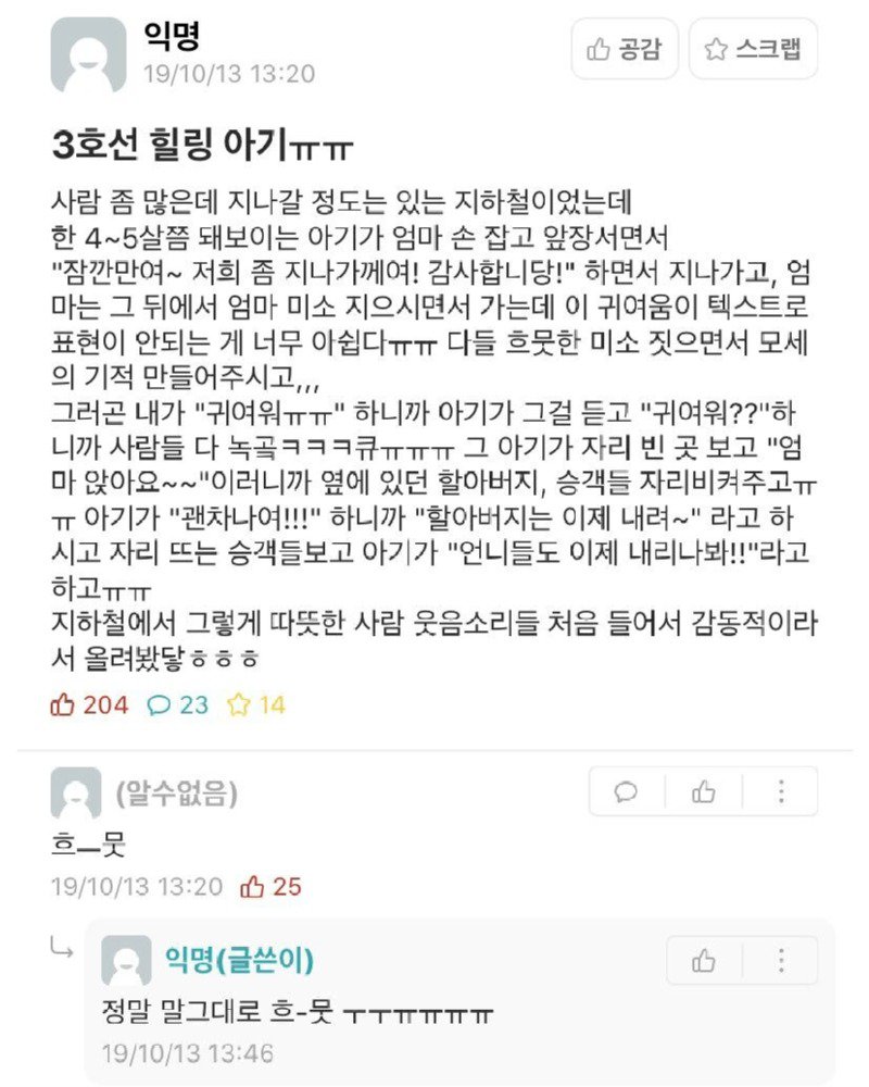 하지만 아기는 여전히 천진난만하게 “괜차나여!!!”라며 환하게 웃섰고, 주변 사람들은 그렇게 귀엽고 사랑스러운 아기의 행동에 감동받았다. 앙증맞은 아기는 할아버지에게 “할아버지는 이제 내려~”라고 말하며 지하철은 웃음과 따뜻한 분위기로 가득 찼다. 아기의 순수한 마음이 전한 감동의 순간, 우리는 모두 이 작은 아이에게서 큰 사랑을 느꼈다.