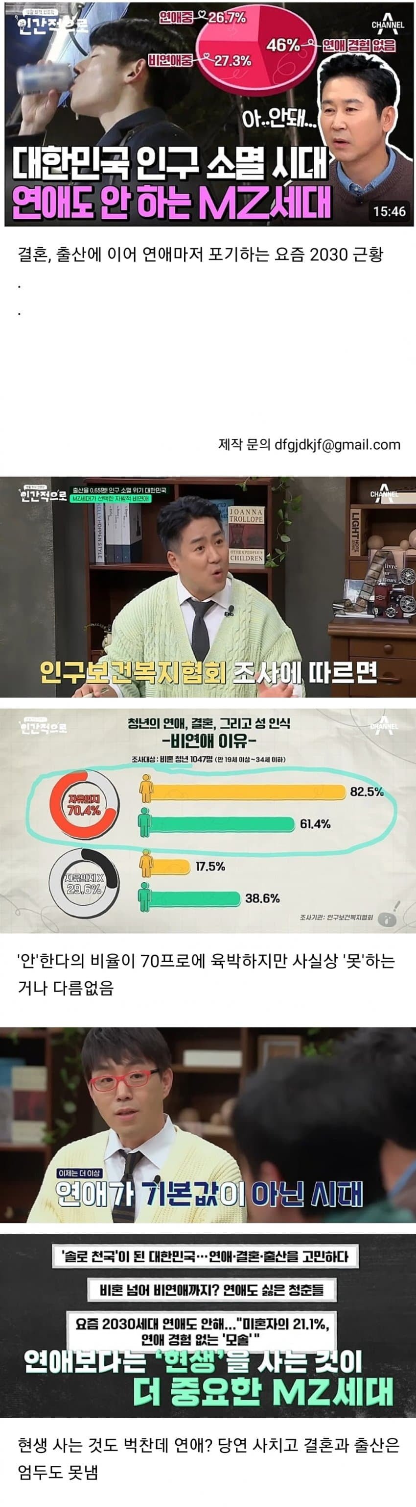 대한민국 2030세대의 연애와 결혼, 출산이 사실상 ‘포기’ 상태에 빠졌다! 최근 조사에 따르면, 무려 226.7%의 청년들이 연애를 하지 않는다고 응답하며, 그 중 27.3%는 아무런 연애 경험이 없는 ‘모솔’ 상태라고 밝혔다. 이어서 이 세대의 실제 연애 비율은 46%에 불과하며, 이들 중 많은 수는 연애는커녕 결혼이나 출산까지도 생각하지 않는다고 주장했다.