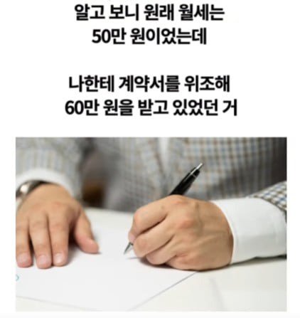 세입자는 곧바로 반박했다. "2만원이 아니라 12만원이 들었고, 월세도 60만원이라고 말씀하셨죠?" 그런데 알고 보니 집주인은 세입자에게 위조된 계약서를 사용해 60만원의 월세를 받고 있었던 것이다! 세입자는 불행히도 모터 수리비를 빼고 38만원을 보내야 했는데, 실수로 48만원을 송금한 것이 발각된 것이다.