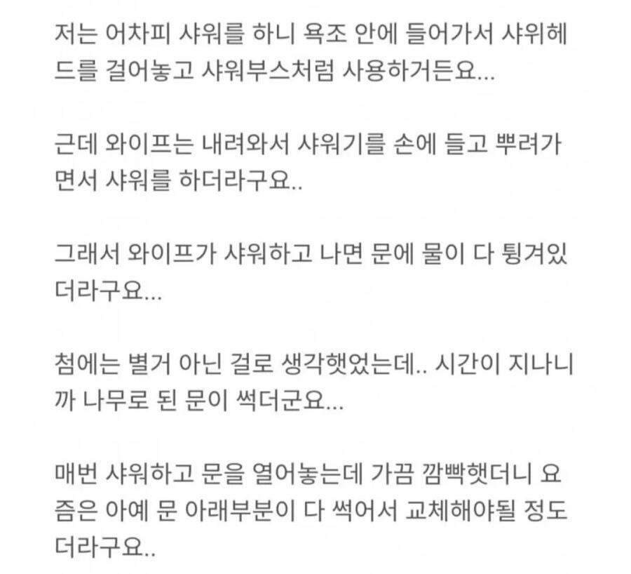 그는 자신은 욕조 안에 들어가 샤워를 하는 것이 자연스럽다고 말했다. 하지만 그의 아내는 샤워기를 손에 들고 세면대 앞에서 물을 뿌리는 방식으로 샤워를 한다고 밝히면서, 이로 인해 욕실 문에 물이 튀는 상황이 계속 발생했다고 주장했다. 처음에는 별 문제가 아니라고 생각했으나, 시간이 지나면서 그가 강조한 카나무 문이 썩기 시작했다는 것이다.