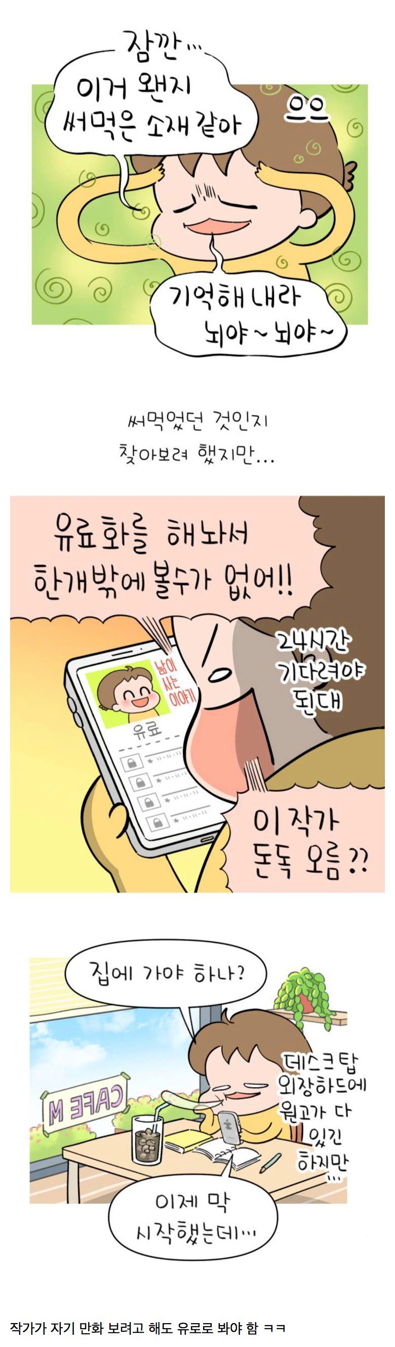 네이버 웹툰 유료회차에 숨겨진 충격적 사실이 드러났다! 이게 무슨 일인가? 작가가 자신의 만화를 보려면 유료 결제를 해야 한다는 소식이 퍼지면서 많은 네티즌들이 충격을 금치 못하고 있다. 이 비극적인 상황 속에서 한 팬은 “이런 걸 예전에 본 것 같은데, 뇌야! 왜 기억이 안 나?”라며 소중한 추억을 되살리려 애쓰고 있다.