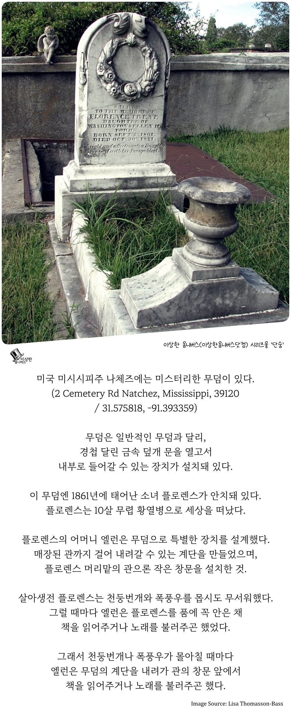 미국 미시시피주 나체즈에 숨겨진 미스터리한 무덤이 입소문을 타고 있다. 이 무덤은 단순한 묘지가 아니다! 경첩이 달린 금속 덮개 문을 열고 무덤 내부로 들어갈 수 있는 특이한 구조로 알려져 있다. 이곳에는 1861년에 태어나 10세에 황열병으로 세상을 떠난 소녀 플로렌스가 영면해 있다.