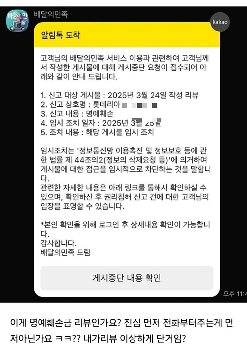 이는 2025년 3월 24일에 작성된 리뷰가 롯데리아를 겨냥한 것이었으며, 그 결과로 '정보통신망 이용촉진 및 정보보호 등에 관한 법률'의 조항에 의해 해당 게시물이 임시적으로 차단된 것입니다. 이에 대해 사용자는 "이게 명예훼손급 리뷰인가요?"라며 반문하면서 상황의 부조리를 지적하고 있습니다.