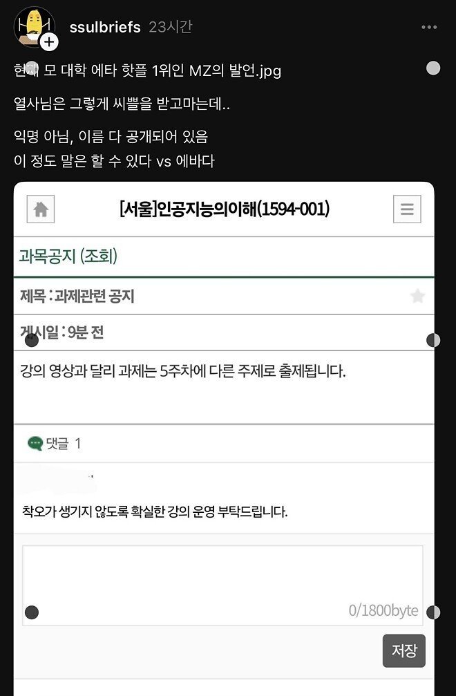 또한, 인공지능의 이해라는 과목에서는 강의 내용과는 다른 주제로 과제가 출제될 것이라는 공지가 올라오며 학생들 사이에 혼란이 가중되고 있습니다. 댓글로도 "착오가 생기지 않도록 확실한 강의운영 부탁드립니다"라는 요청이 이어지고 있어, 이로 인해 강의 운영에 대한 불만이 팽배하고 있습니다.