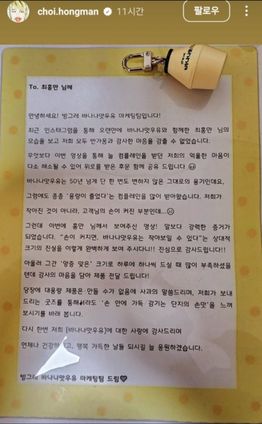 빙그레가 감사하다고 편지랑 바나나우유 왕창 보냄