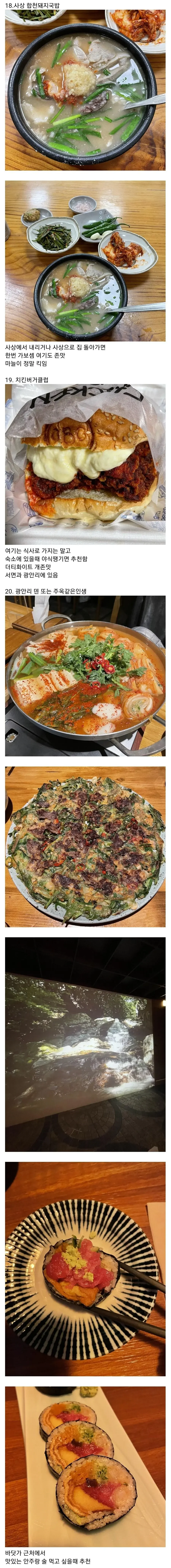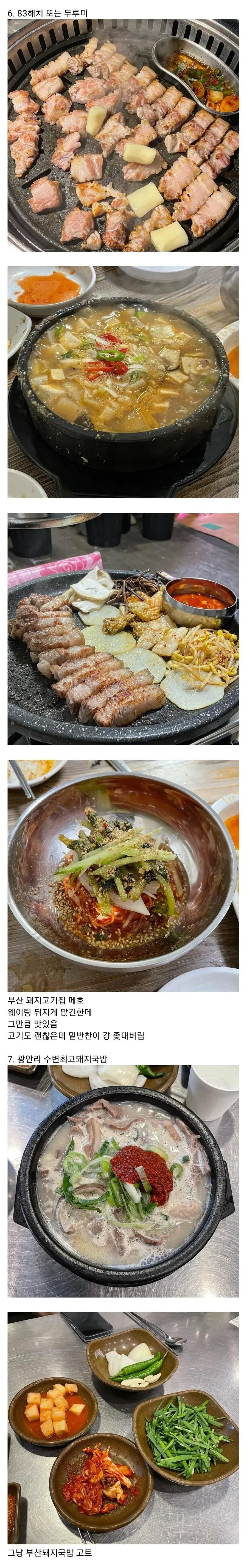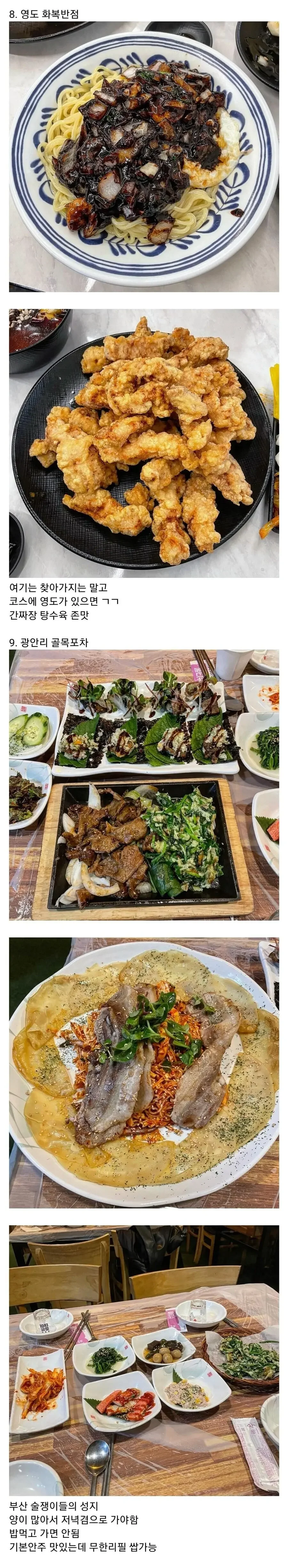 광안리에서는 돼지국밥을 먹으러 수변최고돼지국밥으로 가보라. 부산에서 돼지국밥을 가장 맛있게 즐길 수 있는 곳 중 하나다. 그리고 영도의 화복반점은 간짜장과 탕수육이 정말 일품으로, 영도에 간다면 반드시 들러야 한다.