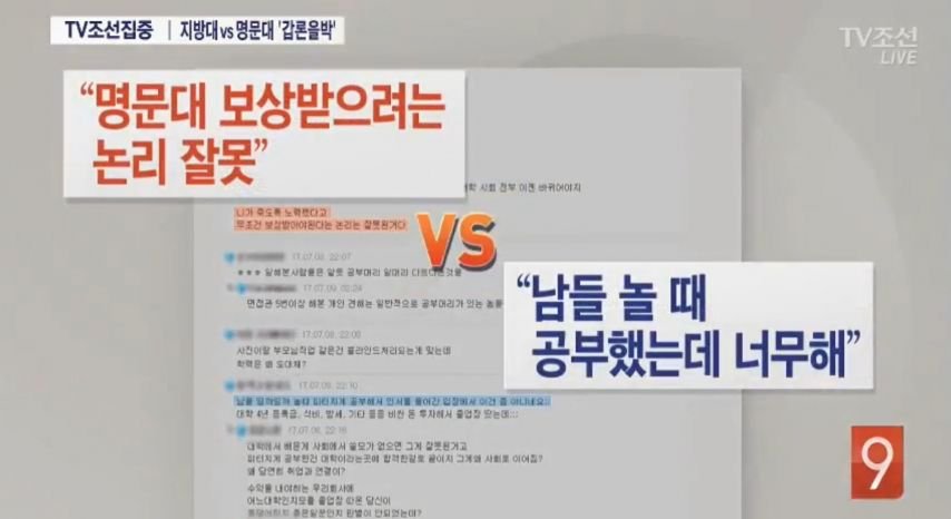명문대 졸업자들은 "열심히 공부한 만큼 보상받아야 하지 않냐"며 목소리를 높이고 있는 반면, 지방대 졸업생들은 "그것은 잘못된 사고방식"이라고 반박하고 있다. 한 지방대 졸업생은 “명문대를 선택한 사람들의 노력에 대한 보상이 무조건 있어야 한다는 논리는 정말 잘못됐다”고 주장했다. 그는 일본 사람들이 똑똑하다고 알려진 이유도 헤아려야 한다고 덧붙였다.