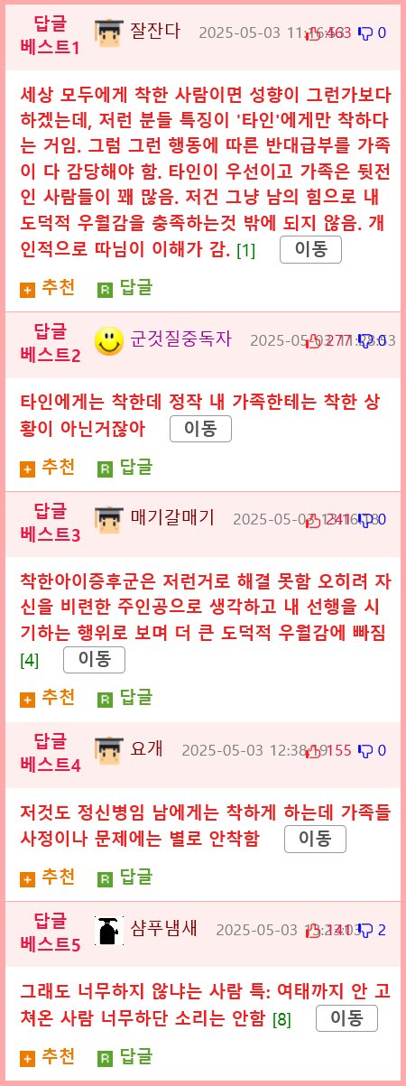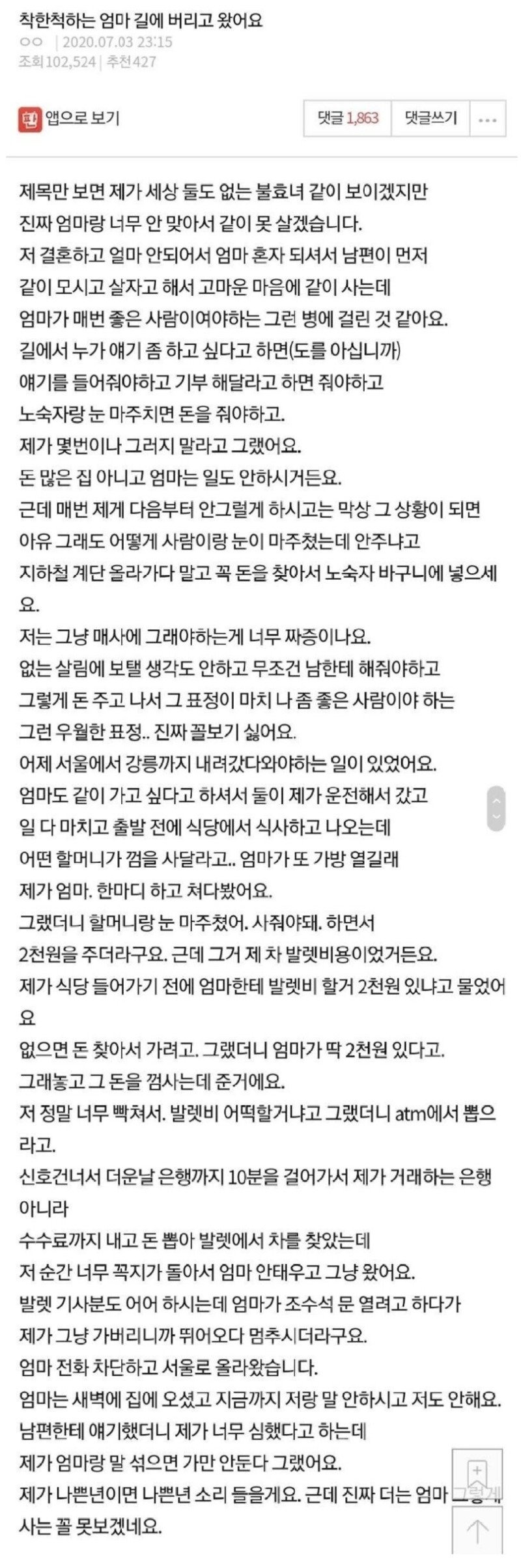 벗어나고 싶은 착한 척하는 엄마와 함께 지내는 고통을 고백한 이 여성의 이야기에 누리꾼들은 동정과 공감을 나타내며 댓글을 달았습니다. "이런 엄마와 어떻게 살아?"라는 물음이 댓글 창을 가득 채우고 있습니다. 과연 그녀는 이 착한 척하는 엄마로부터 벗어날 수 있을까요?