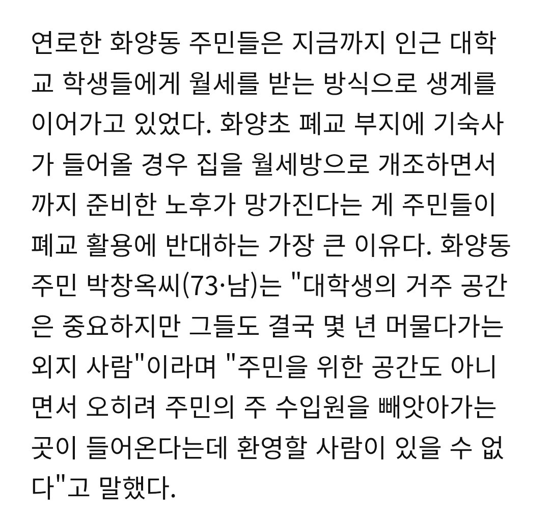 73세의 주민 박창옥씨는 "대학생들이 이곳에 몇 년 동안만 살다가 나가버리면, 내가 쌓아온 월세 수입이 날아가버린다"며 기숙사 건설에 대한 강력한 반대를 표명했다. 이 같은 우려는 충격적이다. 과연 주민들은 자신의 생계를 위해 기숙사 건설을 반대하고 있는 것일까, 아니면 더 큰 의도가 있는 것일까?