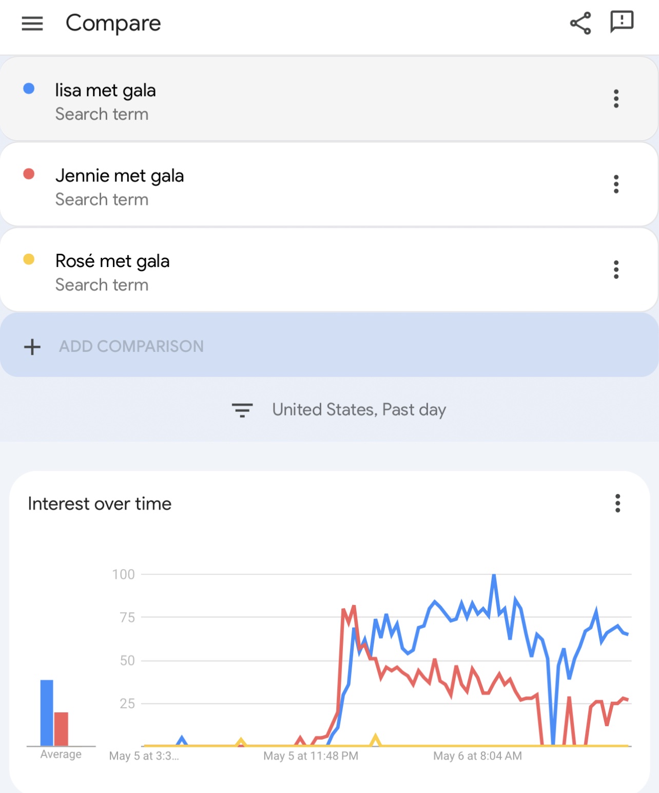 소셜 미디어에서 메트 갈라에 대해 언급된 TOP 10 인물 중 1위에 오른 로제는 빌리 아일리시, 리한나, 킴 카다시안 등과 함께 언급되었지만, 그 와중에 그녀의 관심도는 급감한 것으로 드러났다. 조사에 따르면, 로제의 검색량은 다른 참석자들과 비교했을 때 현저히 낮아 빈자리를 드러내고 있다.