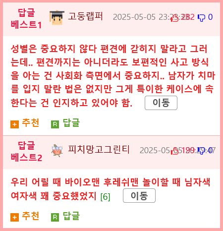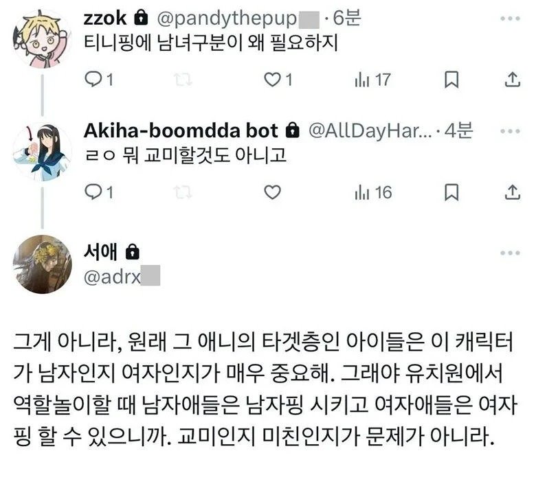 하지만 다른 의견도 만만치 않습니다. "교미할 것도 아닌데, 왜 성별 구분이 필요하냐"는 반응도 있었습니다. 아예 성별이 중요하지 않다는 목소리도 있지만, 일반적인 사고 방식은 사회화의 한 부분으로 꼭 이해해야 한다는 주장도 외면할 수 없는데요. 결국, 모두가 자신만의 한정된 시각으로 편견을 갖고 있는 것은 아니지만, 성별의 구분이 사회적 맥락에서 여전히 중요한 요소라는 점을 감안해야 한다는 이야기가 이어집니다.