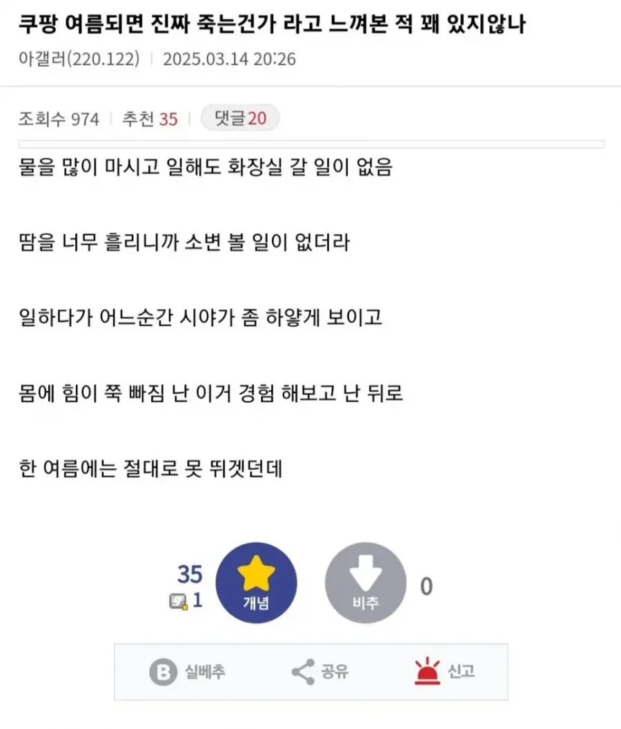 한 익명의 근로자는 "여름 되면 진짜 죽는 건가?"라는 불안한 심정을 토로하며, 더위 속에서 일하기 힘들었다고 고백했다. 그는 "물을 많이 마셔도 화장실에 갈 수 없을 만큼 땀을 흘렸다"며 그 극한 상황을 생생하게 전했다. 그의 증언에 따르면, 갑작스러운 어지럼증과 몸의 힘이 빠지기도 했다고 한다. 이는 여름철 쿠팡 물류센터의 기후가 얼마나 가혹한지를 잘 보여준다.
