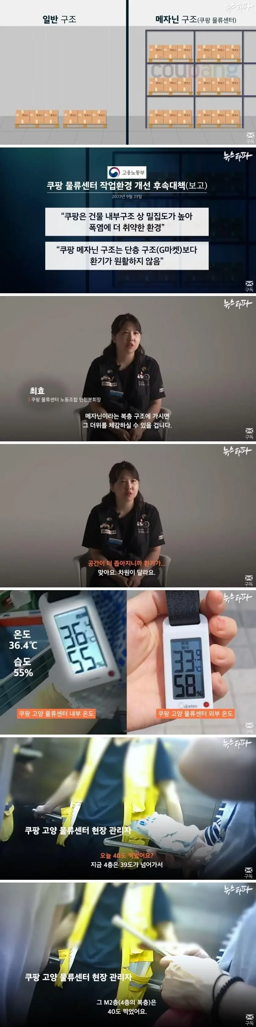 또한, 전문가들은 쿠팡의 메자닌 구조가 여름의 폭염을 더욱 악화시킨다고 경고한다. 고용노동부의 보고서에 따르면, 쿠팡의 물류센터는 밀집도가 높아 더위에 취약하며, 단층 구조에 비해 환기조건이 열악하다고 주장하고 있다. 이로 인해 "온도 36.4°C, 습도 55%"의 환경이 자주 발생하고 있다는 사실이 드러났다.