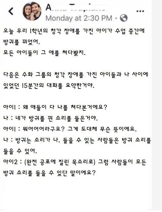 그 아이는 수업이 끝난 후 선생님에게 물었습니다. "왜 애들이 다 나를 쳐다본 건가요?" 선생님은 그의 곤란한 상황을 이해하고, 방귀 소리에 대해 설명해 주었습니다. "방귀는 소리가 나. 들을 수 있는 사람들은 방귀 소리를 들을 수 있어." 이에 대해 아이는 믿을 수 없는 얼굴로 "뭐어어어라구요? 그게 도대체 무슨 뜻이에요?"라며 반응했습니다.