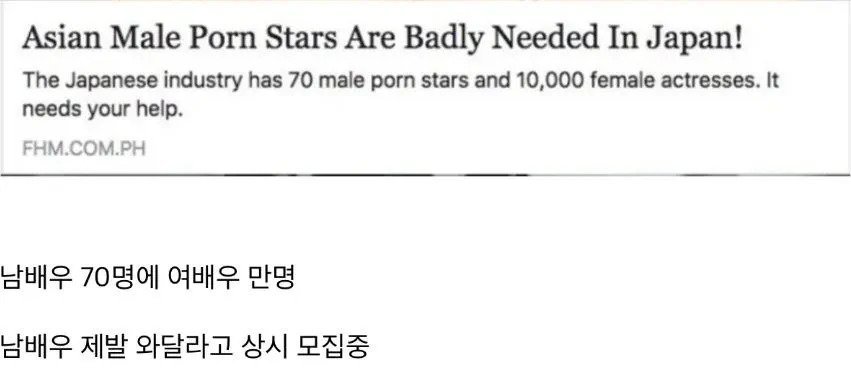 일본 AV 업계가 심각한 구인난에 처해 있습니다! 무려 10,000명의 여성 배우에 비해 남성 배우는 단 70명뿐! 이 어마어마한 비율에 일본 산업이 비상이 걸렸습니다. 이제는 남배우를 간절히 찾고 있다는 소식이 전해졌습니다. FHM.COM.PH에 따르면, 일본 AV 업계는 현재 남성 배우 모집에 혈안이 되어 있으며, 참을성 있게 지원자를 기다리고 있는 상황입니다.