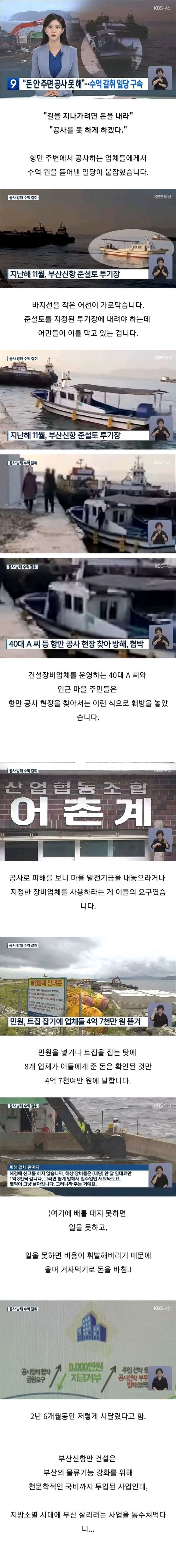 작년 11월, 부산신항의 준설토를 지정된 투기장으로 보내야 하는 상황에서 작은 어선이 바지선을 막고, 어민들이 이 작업을 방해하는 일이 발생했습니다. 범죄의 주범으로 지목된 40대 A씨와 그의 일당은 인근 마을 주민들과 함께 공사 현장을 찾아가 “길을 지나가려면 돈을 내라”는 황당한 요구를 일삼았습니다. 이들은 건설장비 업체에도 압박을 가하며 자신들의 뜻을 관철시키기 위해 공사를 방치하도록 강요했습니다.