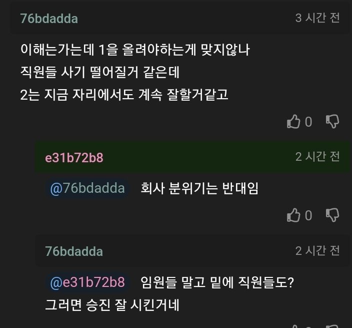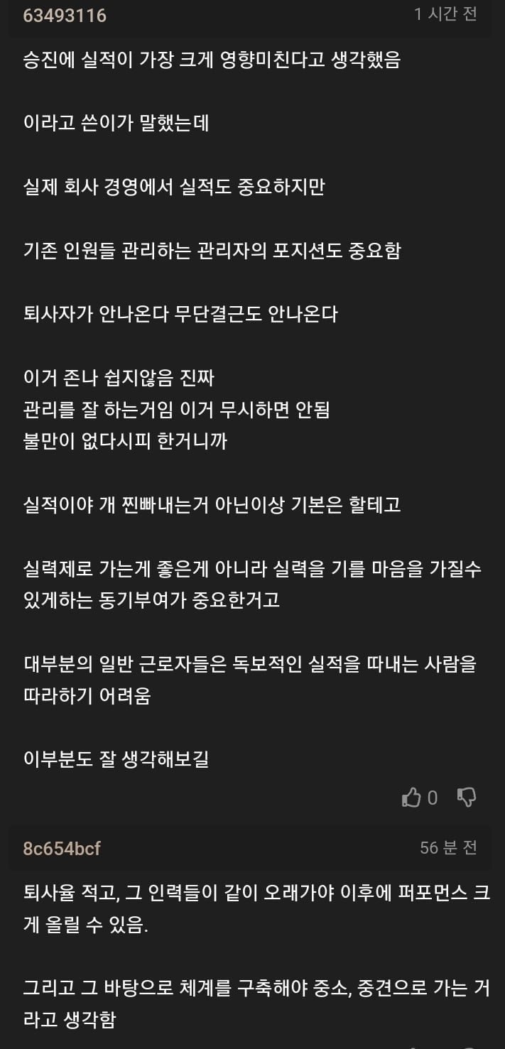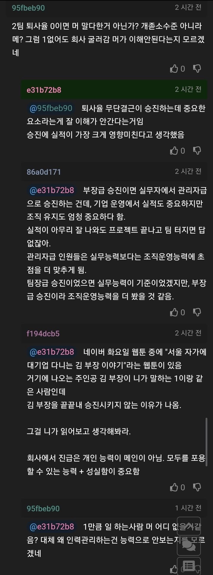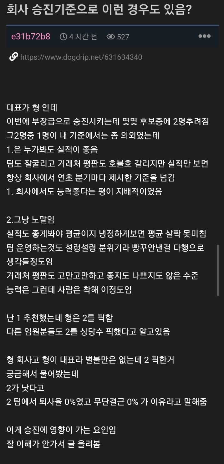 직원이 추천한 후보 1과는 달리, 대표는 후보 2를 선택했고, 심지어 다른 임원들도 같은 방향으로 의견을 모았다. 지원자가 팀을 이끌고 있었던 이유로 '무단 결근 0%'와 '퇴사율 0%'라는 지표가 언급되었는데, 이는 이 직원의 인품과 팀 분위기에 대한 강조로 해석될 수 있다. 하지만 많은 이들은 이렇게 중요한 승진 기준이 실제 업무 성과와는 거리가 멀다는 점에 혼란스러워하고 있다.