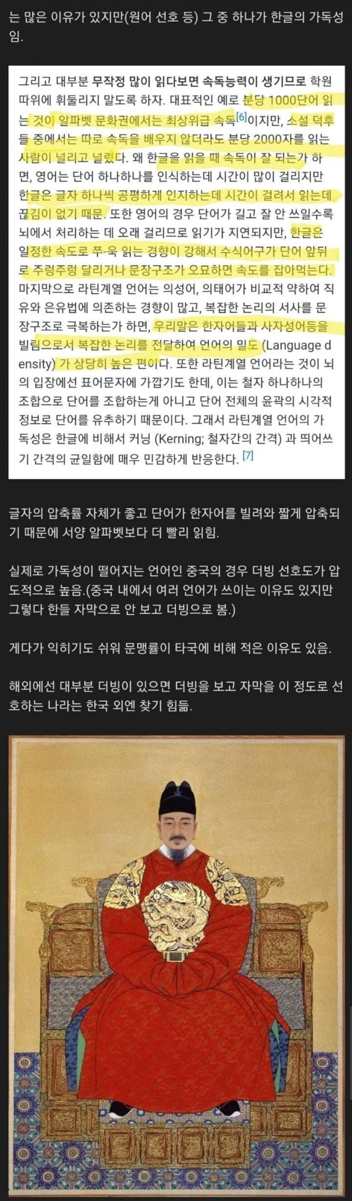 한국인들이 더빙보다 자막을 선호하는 이유는 각종 선호도의 차이를 넘어서, 무엇보다도 한글의 놀라운 가독성에 큰 원인이 있습니다! 여기에 속독의 비밀도 얽혔는데, 학원 교육 대신 무작정 많이 읽다 보면 누구나 고속 독서 능력을 뿌리내릴 수 있습니다. 미국 등 알파벳 문화권에서는 분당 1000단어 읽는 것이 속독의 정점이지만, 한국의 소설 덕후들은 분당 2000자를 후딱 읽는 경우도 많답니다!
