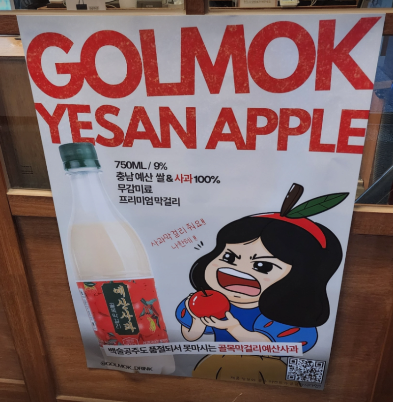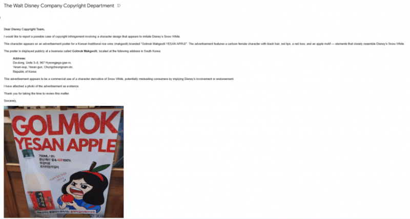 그런데 충격적인 뉴스가 이어졌습니다! 월트디즈니측이 이 막걸리의 광고 포스터를 보고 저작권 침해를 의심하고 나선 것입니다. 광고에 등장하는 검은 머리의 여성 캐릭터가 디즈니의 '백설공주'와 너무 닮았다는 주장이 제기된 것이죠. 빨간 리본을 매고 사과를 들고 있는 이 캐릭터는 소비자들 사이에서 큰 화제가 되었으며, 디즈니로부터의 소송 위협이 임박했다고 합니다.