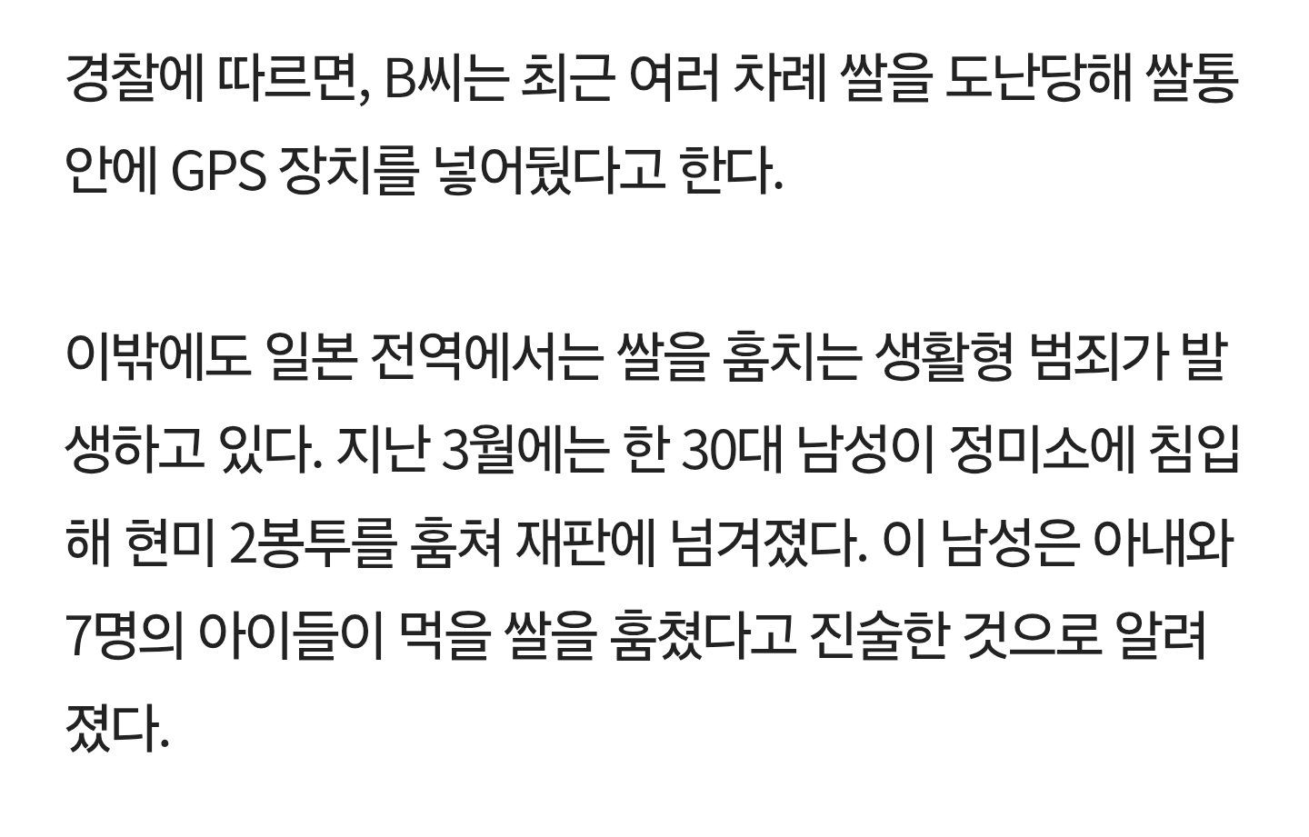 경찰에 따르면, 이 노인은 여러 번 쌀이 도난당한 후 GPS를 설치하게 되었고, 작전은 성공적이었다. 그러나 이는 단지 이 노인만의 일이 아니다. 일본에서는 원치 않는 범죄가 잇따르고 있으며, 지난 3월에는 한 30대 남성이 정미소에 침입해 현미 두 봉지를 훔쳐 법의 심판을 받게 되었다. 그는 아내와 7명의 자녀를 위해 쌀을 훔쳤다고 진술하며, 사회적 약자의 고뇌를 전했다.