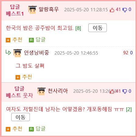 이 남성의 충고는 여러 네티즌들의 의견을 불러일으켰고, 그 중 한 명은 "여자도 저럴 진데 남자는 어떻겠음?"이라며 경각심을 느끼는 댓글을 남겼습니다. 또 다른 댓글에서는 "한국의 밤은 공주밤이 최고"라며 유머를 섞은 반응을 보였고, 이에 대답하는 댓글이 이어지며 온라인 상값 유머로 넘어가기 시작했습니다.