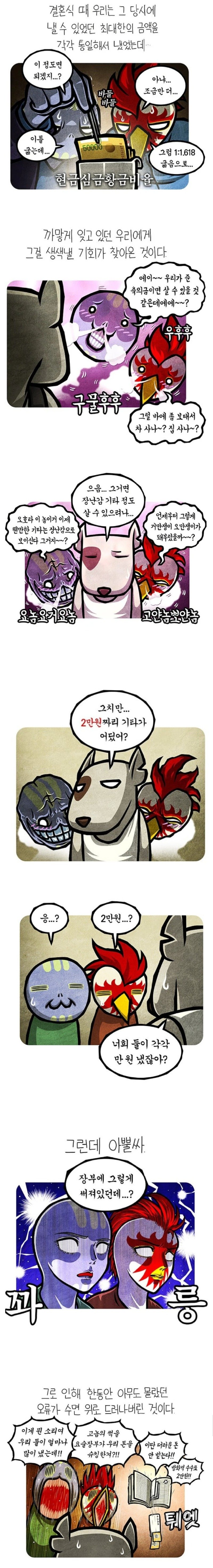 이틀 굶어가며 간신히 모은 5만원의 ‘현금 심금 황금 비율’로 계산하니, 친구들의 축의금으로 장난감 기타 정도는 살 수 있을 거라는 착각에 빠졌다. 놀랍게도 그 친구는 “그걸로 차나 집을 사야 되지 않겠냐?”며 고고하게 말했다는 것. 대체 언제부터 이렇게 거만해진 것일까?