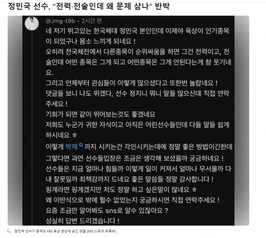 특히 이 논란은 1위를 차지한 정민국 선수의 유튜브 댓글로 더욱 확대되었습니다. 정민국 선수는 윤여준의 비판에 불쾌감을 드러내며 "이건 전력과 전술의 문제이지 문제 삼을 일이 아니다!"라고 반박했습니다. 네티즌들은 윤여준 해설위원의 발언과 정민국 선수의 반응에 대해 다양한 의견을 쏟아내고 있으며, 사회적 논란이 일어나고 있는 가운데, 한국 여자 육상 최고 기록인 9분 59초 054에 비해 남자 선수들의 경기력에 대한 의문도 제기되고 있습니다.
