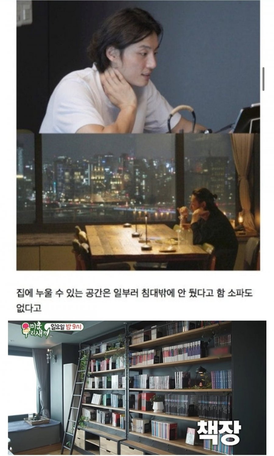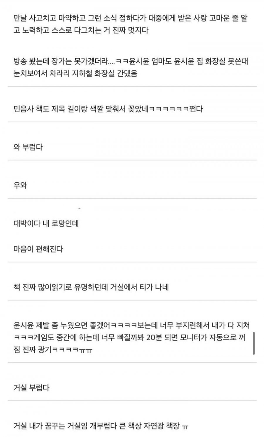 하지만 집 안은 그가 스스로의 철학을 강하게 반영하고 있다. 윤시윤은 공간을 극도로 제한해, 누울 수 있는 곳은 침대 밖에 두지 않았다고 전해진다. 소파조차 없고, 대신 거실 양쪽에 장식된 책장들로 채워져 있는 모습을 보면, 더 이상 청소와 정리가 필요 없는 완벽한 상태다.