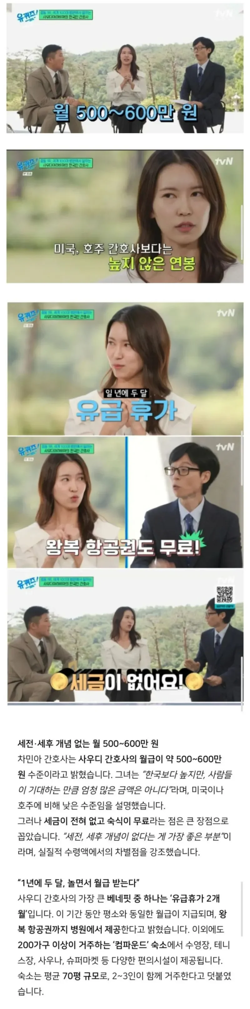 사우디아라비아에서 일하는 한국인 간호사들의 월급이 화제를 모으고 있다! 500만 원에서 600만 원의 월급을 받고 있다는 이들은 미국이나 호주와 비교하면 상대적으로 낮은 수준의 연봉을 받고 있지만, 세금이 0이라는 놀라운 사실이 밝혀졌다. 이는 세전, 세후 개념이 무의미할 정도로 수입의 실질적 가치가 높다는 것을 의미한다.