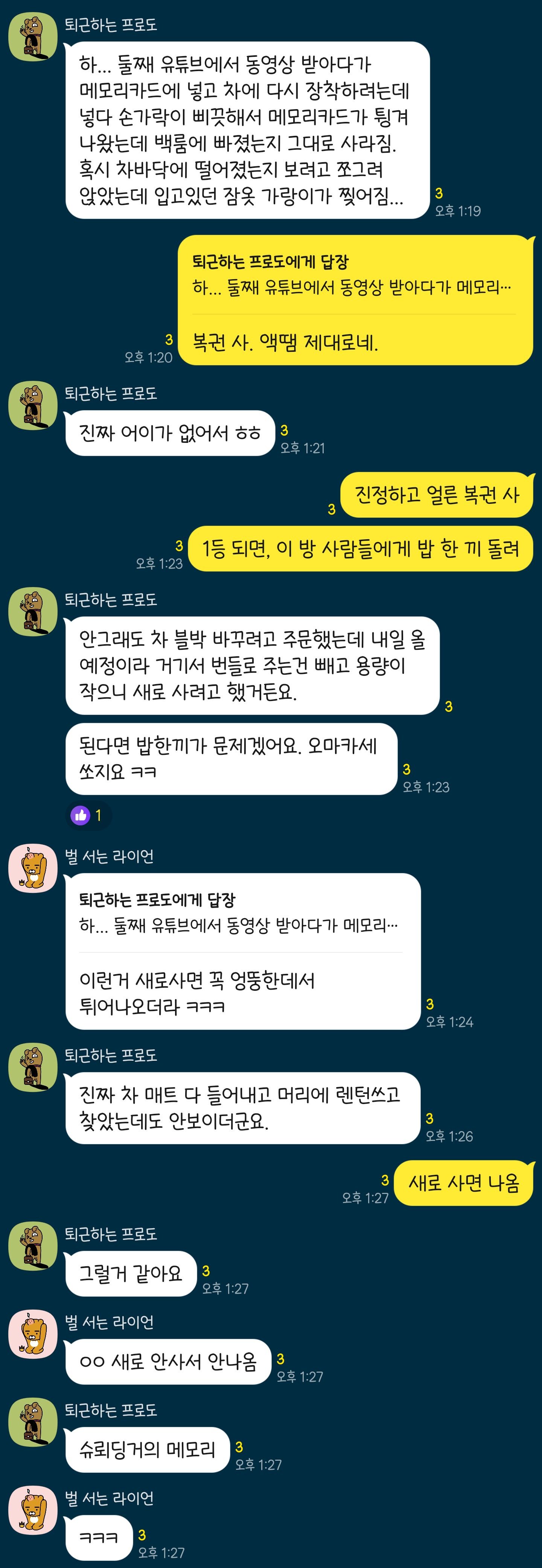그런데 사건은 여기서 끝나지 않았습니다. 프로도는 이 황당한 상황을 친구들과 공유하며 복권을 사자는 제안을 받았습니다. 친구들은 "액땜 제대로네!"라고 웃으며 위로했지만, 프로도는 괜히 차에 블박을 새로 달기로 주문한 터라 더욱 허탈해졌습니다. 어떻게든 메모리카드를 찾아보려 했던 그는 차 매트를 다 들어내고 머리에 렌턴을 쓴 채로 찾아보았지만 결국 번번이 실패했습니다.