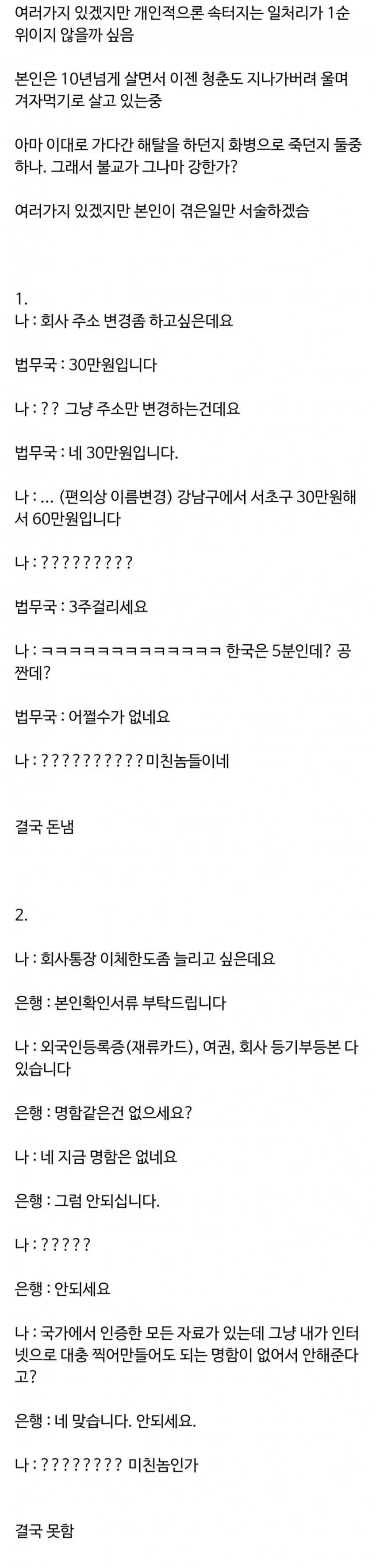 첫 번째 사건은 회사 주소 변경이었다. 그는 법무국에 방문해 "주소만 변경하고 싶은데요"라고 말했으나, 법무국은 "30만원입니다"라는 황당한 답변으로 그의 입을 다물게 했다. "단순히 주소 바꾸는 건데?"라고 반문했지만, 법무국은 "네, 30만원입니다"라는 기가 막힌 대답을 계속했다. 결국 그는 강남구에서 서초구로 주소를 변경하는 데 무려 60만원을 썼고, "3주 걸리세요"라는 안내를 받자 그의 인내심은 바닥을 쳤다. 한국에서는 5분 만에 해결하는 일인데 이곳에서 왜 이리 시간이 걸리는지 이해할 수 없다며 분통을 터뜨렸다.