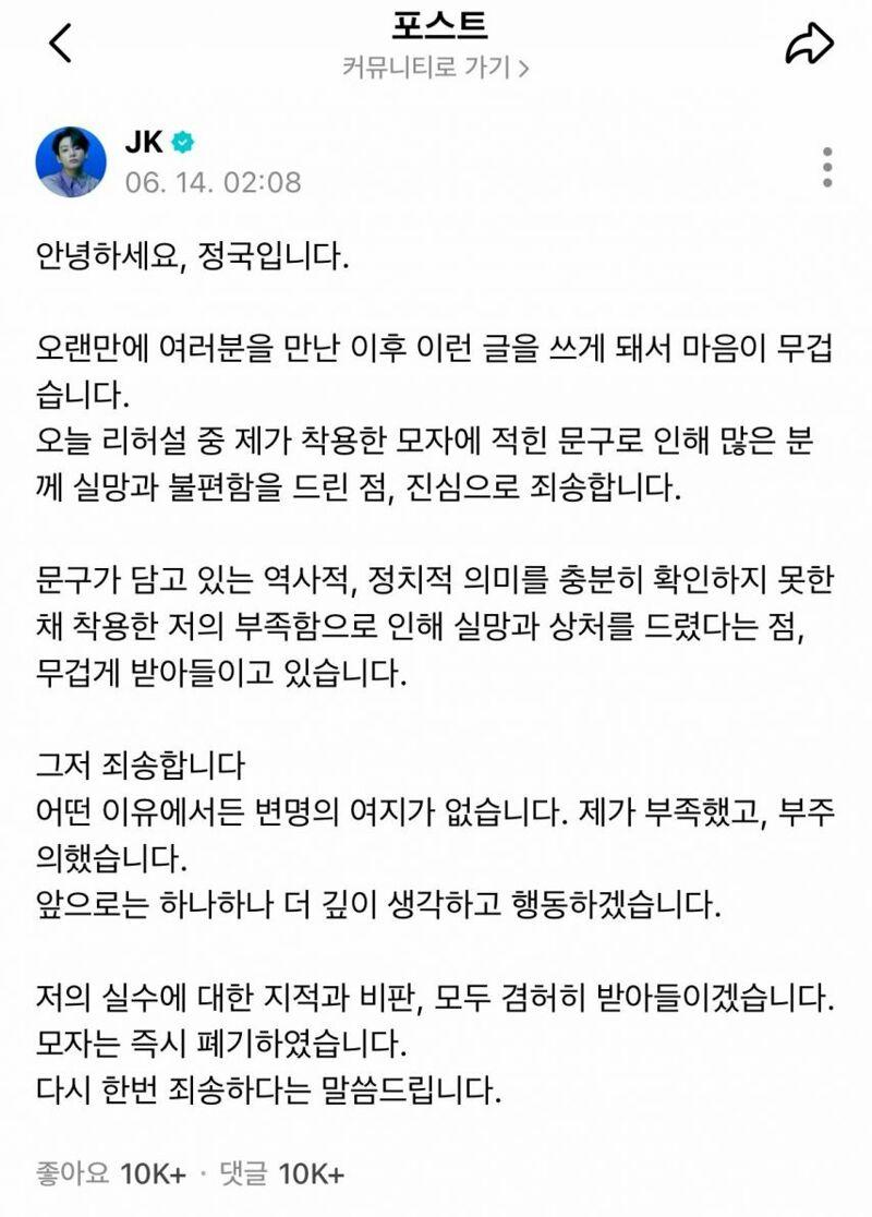 정국은 이 논란에 대해 사과하며, 자신이 그 문구의 역사적 의미를 충분히 인식하지 못하고 착용했다는 사실을 인정했습니다. 많은 팬과 대중이 그를 실망시키고 불편함을 느꼈다는 이유로 깊은 유감의 뜻을 전했는데, 그는 “어떤 변명도 할 수 없다”며 자신의 부족함을 통감했습니다.