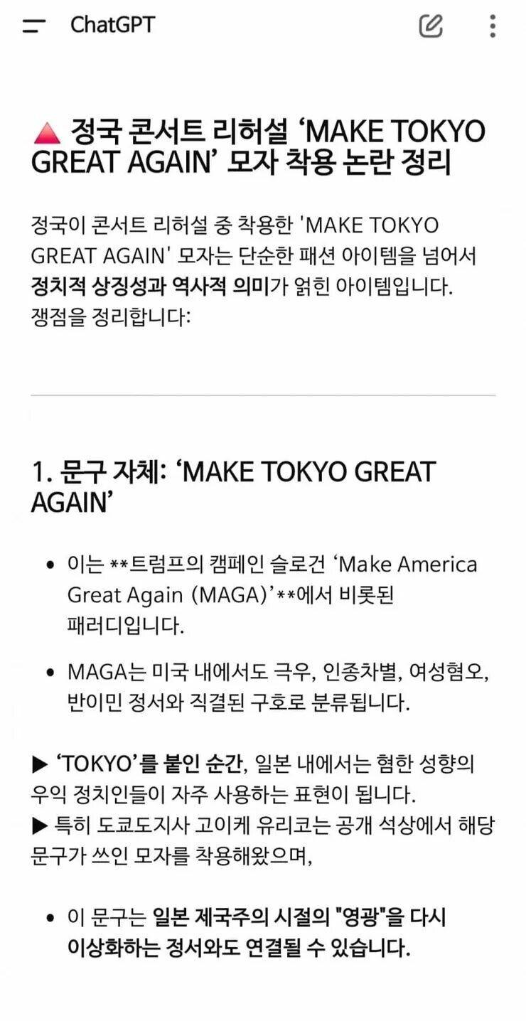 안녕하세요, BTS의 정국이 충격적인 사과문을 발표했습니다! 지난 주, 정국이 콘서트 리허설 중 착용한 모자 때문에 거센 논란에 휘말렸습니다. 해당 모자에 적힌 문구는 "MAKE TOKYO GREAT AGAIN"으로, 이는 정치적 상징성이 강한 아이템으로 여겨지고 있습니다.