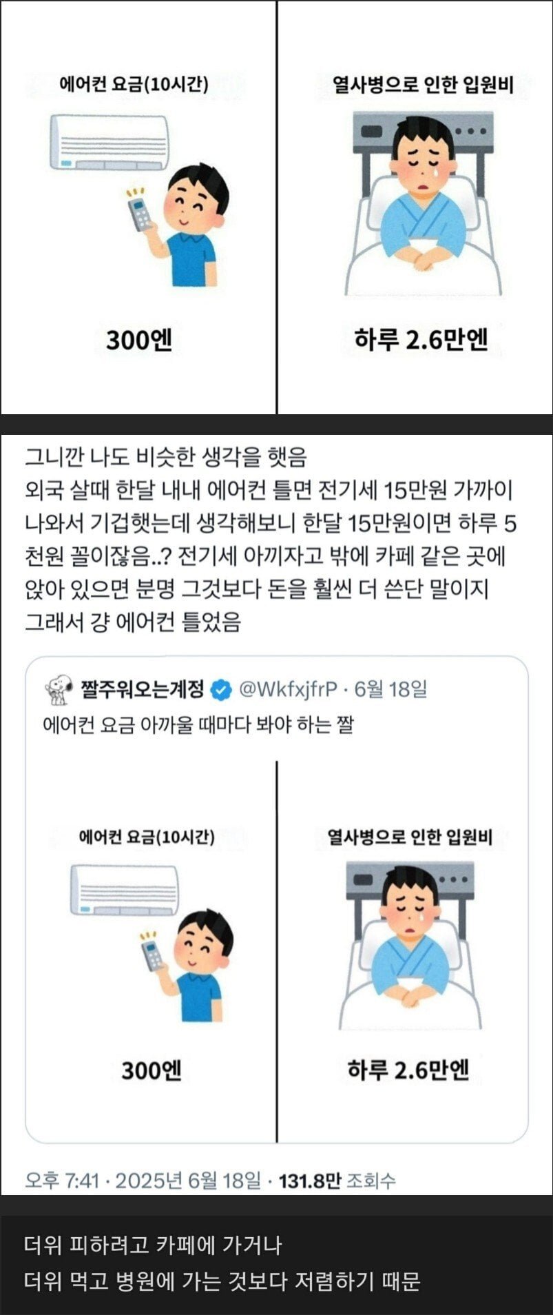 여름의 역대급 더위, 에어컨이 필수라는 주장이 힘을 받고 있다. 한 제보자는 10시간 에어컨을 사용했을 때의 전기세와 열사병에 걸려 입원하게 되는 비용을 비교해 충격적인 데이터를 공개했다. 열사병으로 인한 입원비는 무려 300엔, 하루에 2.6만엔이 든다고 한다.