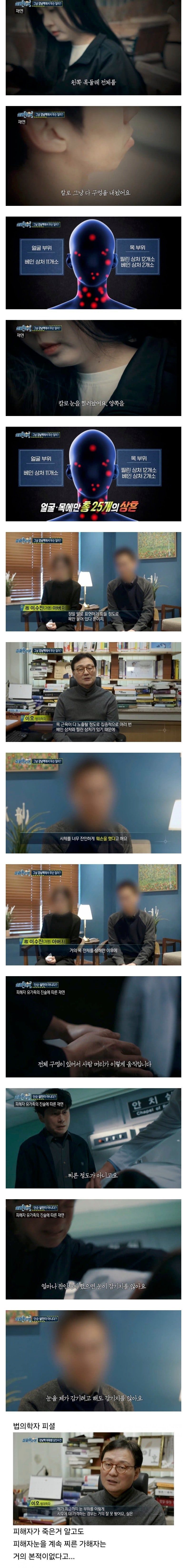 피해자 이수진(가명)의 상처는 그야말로 horrifying합니다. 목 둘레 전체가 칼로 깊이 파여 있었고, 얼굴과 목 부위에는 무려 25개의 상처가 발견되었습니다. 찔린 상처는 12개, 베인 상처는 11개, 그리고 또 다른 베인 상처가 2개로, 실화와는 상상할 수 없는 처참한 상태입니다. 특히, 범인은 피해자의 눈을 찌르는 등 잔혹한 방식으로 범행을 저질렀습니다.