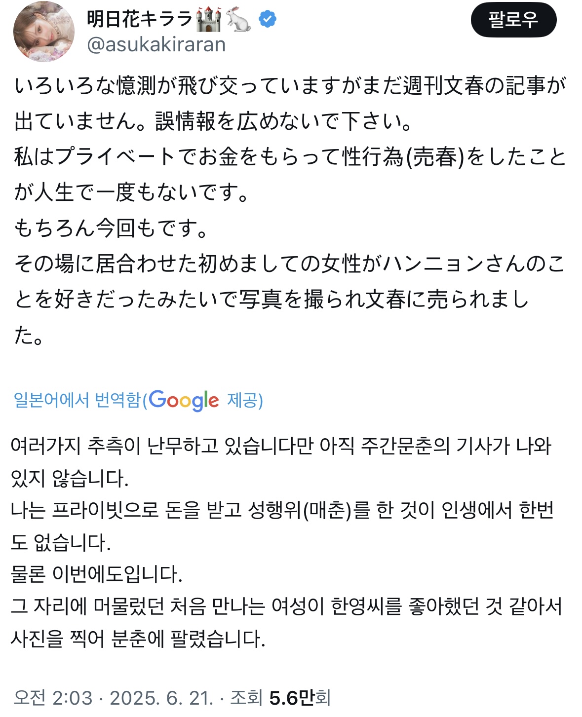 아스카 키라라가 신비로운 입장문을 공개하며 세상을 떠들썩하게 만들었다! 그녀는 여러 추측이 난무하는 가운데, 아직 주간문춘의 기사가 나오지 않았다고 밝히며 혼란을 잠재우려 하고 있다. 그녀는 "나는 사적인 상황에서 돈을 받고 성행위를 한 적이 없다"는 강력한 반박으로 논란에 휘말렸다.