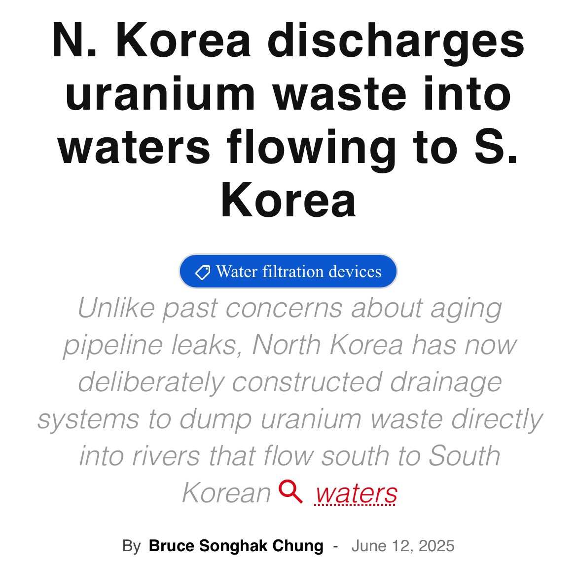 최근 후쿠시마 오염수 방류 소식이 전 세계를 떠들썩하게 만들고 있다. 그리고 이 상황은 더욱 악화되고 있다. 북한이 남한으로 흘러드는 수역에 우라늄 폐수를 방류하기 시작했다는 충격적인 소식이 전해졌다. 이는 단순한 누수 문제가 아닌, 북한이 의도적으로 배수 시스템을 구축하여 바로 강으로 방출하고 있다는 사실이다.