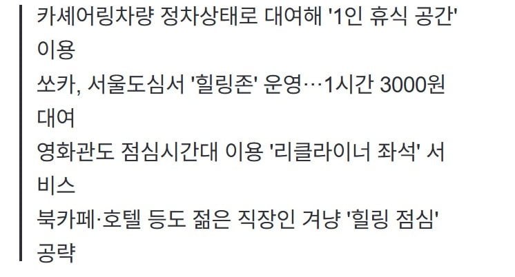 책을 읽거나 한적한 카페에서 휴식을 취하고 싶은 직장인들까지, 호텔과 북카페 역시 '힐링 점심'에 맞춘 서비스를 출시하며 젊은 세대를 겨냥하고 있다. 요즘 직장인들, 낮잠은 물론 '힐링'이 필수인 시대가 도래했다! 당신은 어떤 공간에서 힐링을 원하나요?
