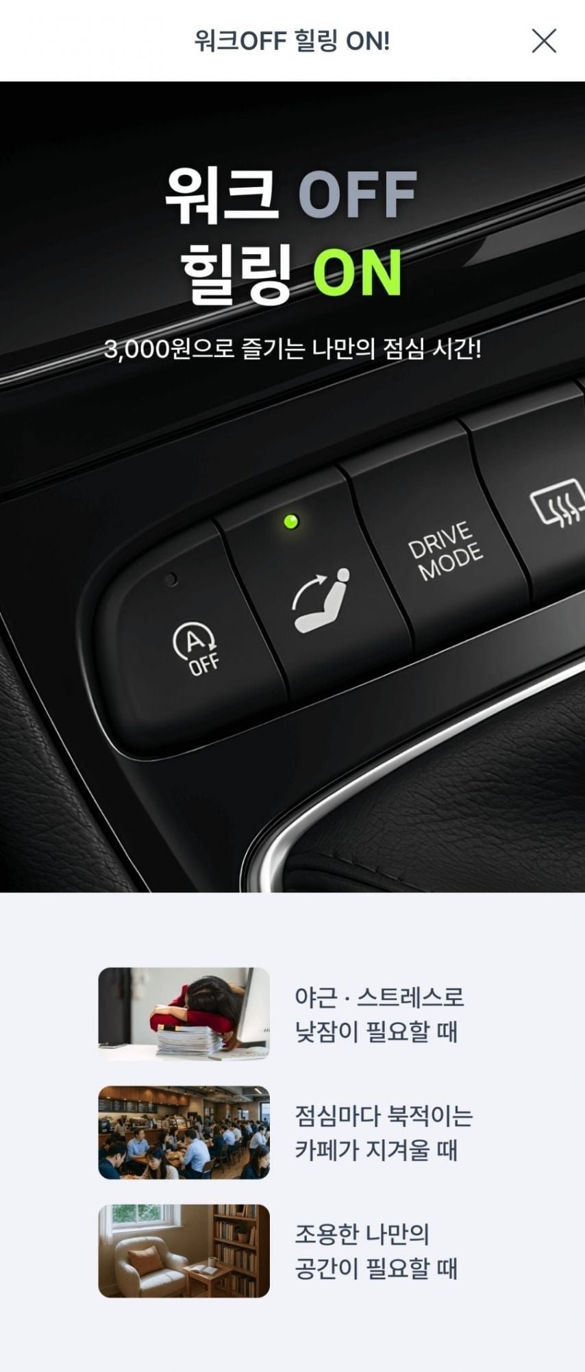 그 주인공은 쏘카! 서울 도심에 위치한 쏘카 힐링존에서는 1시간에 단 3,000원으로 카셰어링 차량을 빌릴 수 있고, 이 차량은 이제 '1인 휴식 공간'으로 변모했다. 직장인들은 잠깐의 낮잠을 위해 카페 대신 차를 선택하고, 스트레스와 피로를 씻어내는 새로운 트렌드가 형성되고 있다. "워크 OFF, 힐링 ON!"이라는 슬로건 속에 담긴 이들은, 야근과 밀린 업무에 지친 몸과 마음을 재충전하기 위해 이색적인 방법을 택하고 있다.