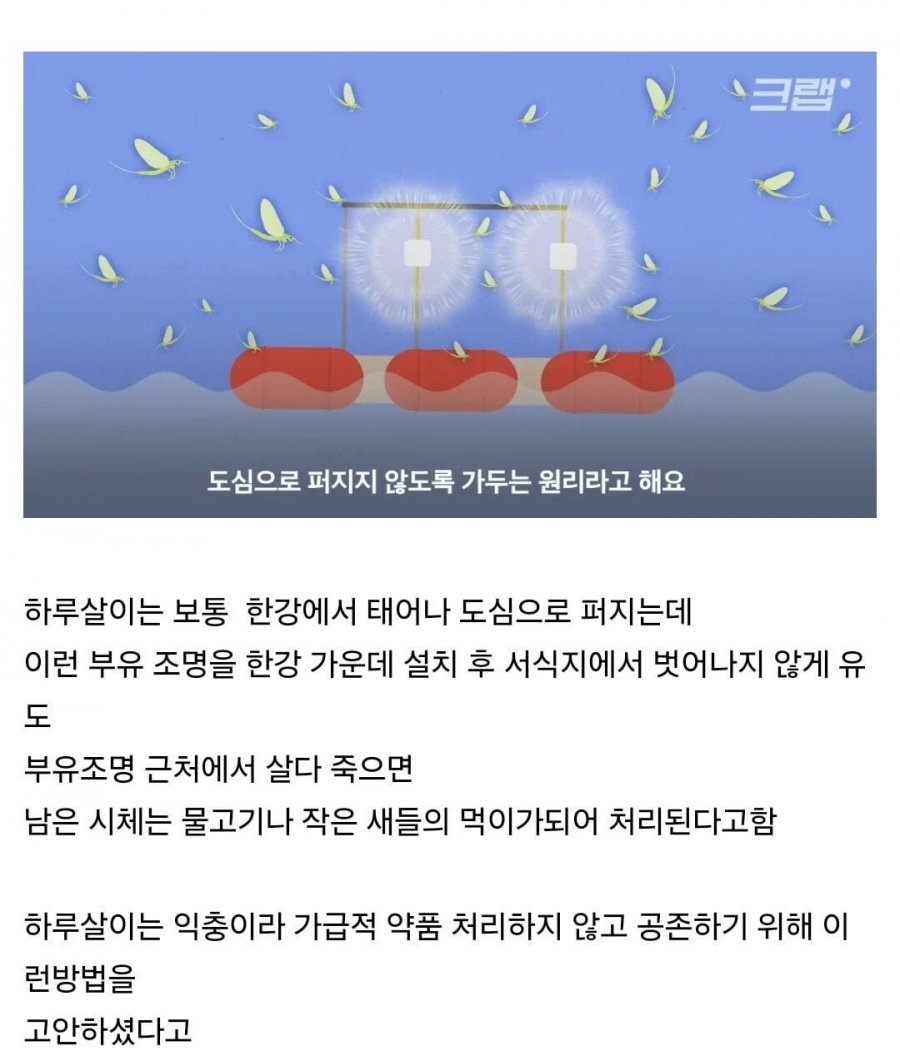 최근 수도권에서 하루살이가 사라진 이유가 밝혀졌습니다! 도심으로 번지지 않도록 전혀 예상치 못한 방법으로 가두어 두었다는 제보가 들어왔습니다. 바로, '크랩'이라는 부유 조명을 한강 중앙에 설치한 것이죠. 이 조명이 하루살이의 서식지를 완벽하게 차단하고, 대신 부유 조명 근처에서만 살게 만든다고 합니다.
