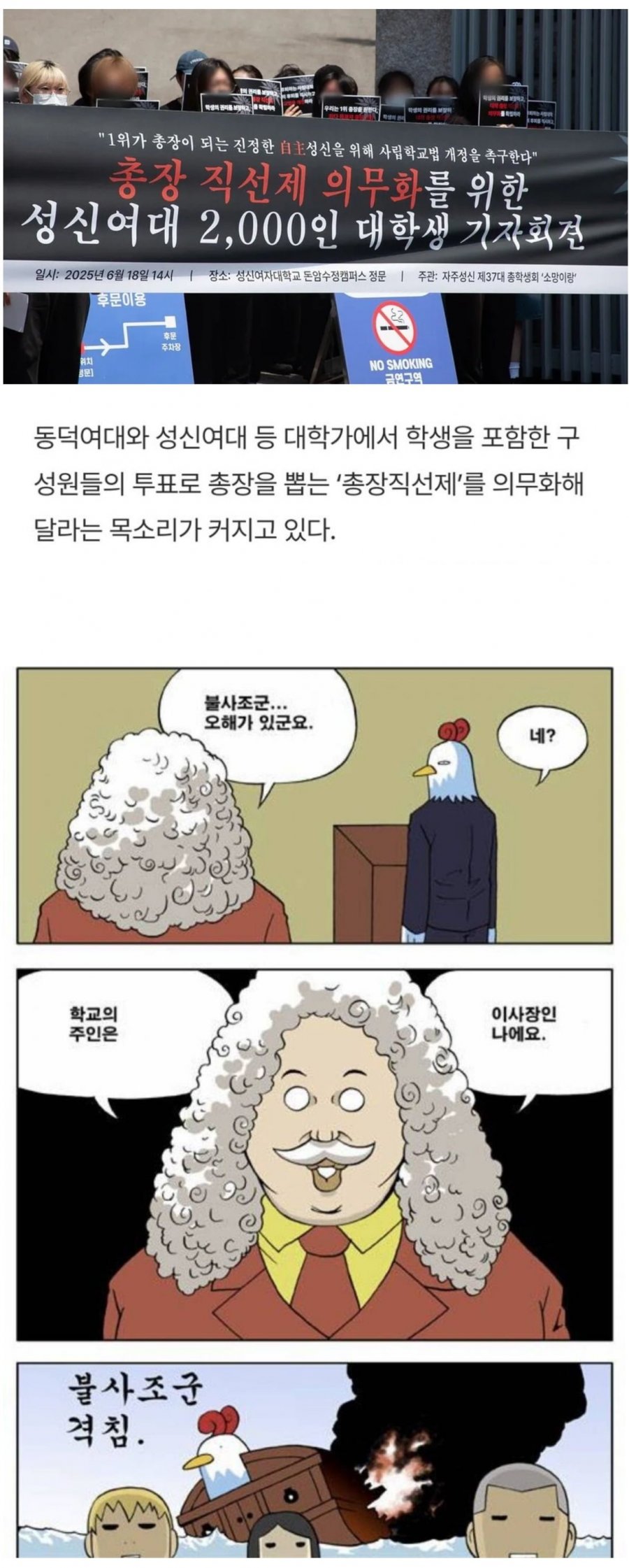그러나 이사장이 자신이 손쉽게 미디어의 왜곡에 휘말리며 "나는 불사조군"이라고 해명하기까지 했다는 점에서, 복잡한 궤도를 만들어가고 있는 이 사건의 정치적 함의를 무시할 수 없습니다. 차후 이 모습들은 성신여대 뿐만 아니라 한국 대학가 전역에서 벌어지는 학생 정치의 아이콘으로 남을 가능성이 큽니다.