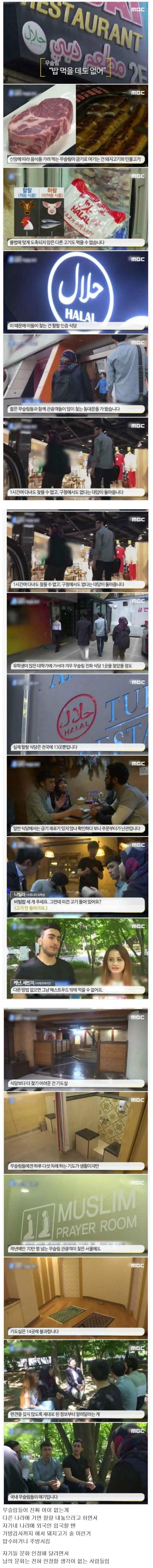 최근 MBC가 보도한 바에 따르면, 동대문의 유동 인구가 많은 지역에서도 할랄 식당을 찾기란 1시간 이상 헤매고도 찾지 못하는 일이 많았다고 한다. 구청에 문의해봐도 "모르겠다"라는 답변만 돌아온다. 심지어 대학교 근처에서 간신히 찾은 무슬림 친화 식당은 전국에 단 13곳밖에 되지 않는 실정이다.