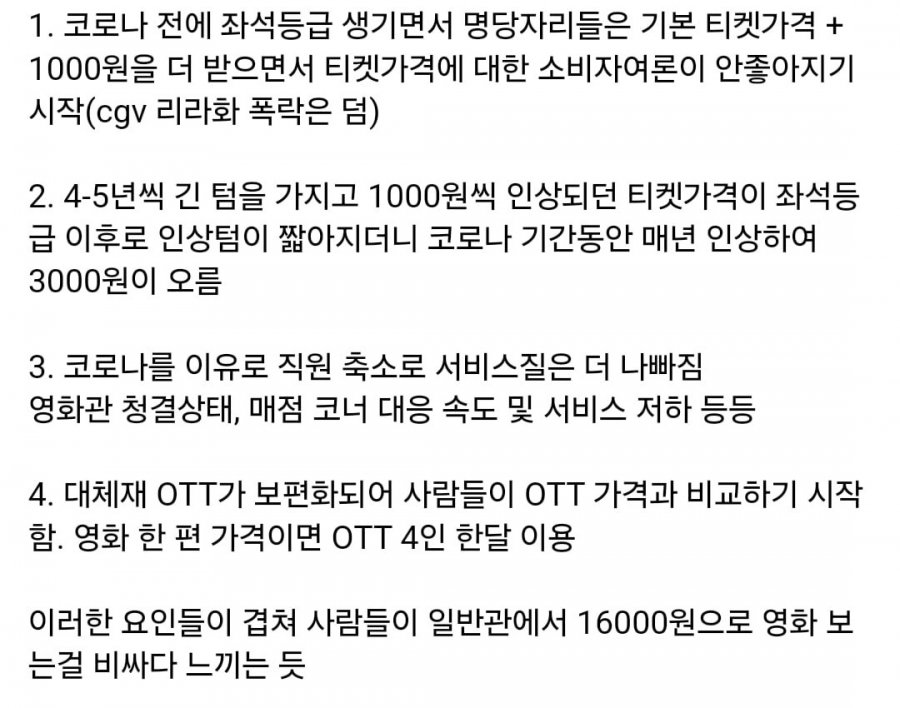 더욱 충격적인 사실은, 티켓 가격 인상이 1000원 단위로 계속해서 이루어졌던 이른바 "장기적 인상" 대신, 좌석 등급제가 도입된 이후로 인상 주기가 짧아지면서 불과 몇 년 사이에 총 3000원이 오르며 관객들을 경악에 빠뜨렸다는 점이다. 게다가 코로나19 기간 동안 영화관은 매년 끊임없이 가격을 인상하는 추세를 보였다. 그 결과, 현재 16000원의 대가를 치르며 영화를 관람하는 것이 관객들에게는 큰 부담으로 작용하고 있다.