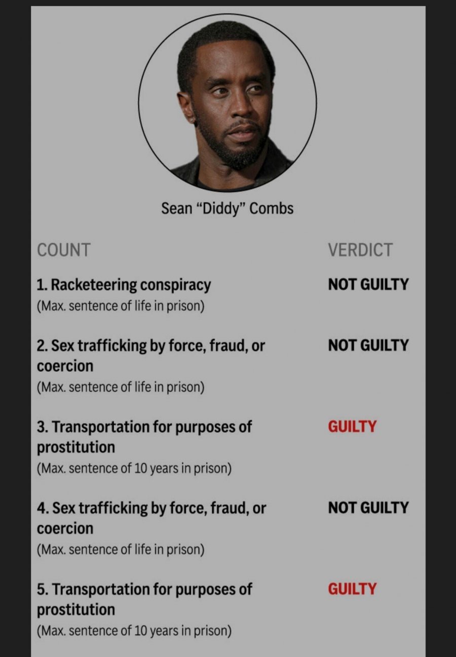 디디는 여러 중범죄 혐의로 기소되었는데, 그 중 첫 번째는 음모에 의한 갈취였습니다. 그러나 이 혐의에 대해서는 판결이 무죄로 나왔고, 최대 무기징역형을 피하게 되었습니다. 하나의 혐의는 성매매의 목적으로 불법 운송에 대한 것이었고, 이 부분에서는 유죄 판결을 받았습니다. 징역 10년의 중형이 선고될 가능성이 높습니다.
