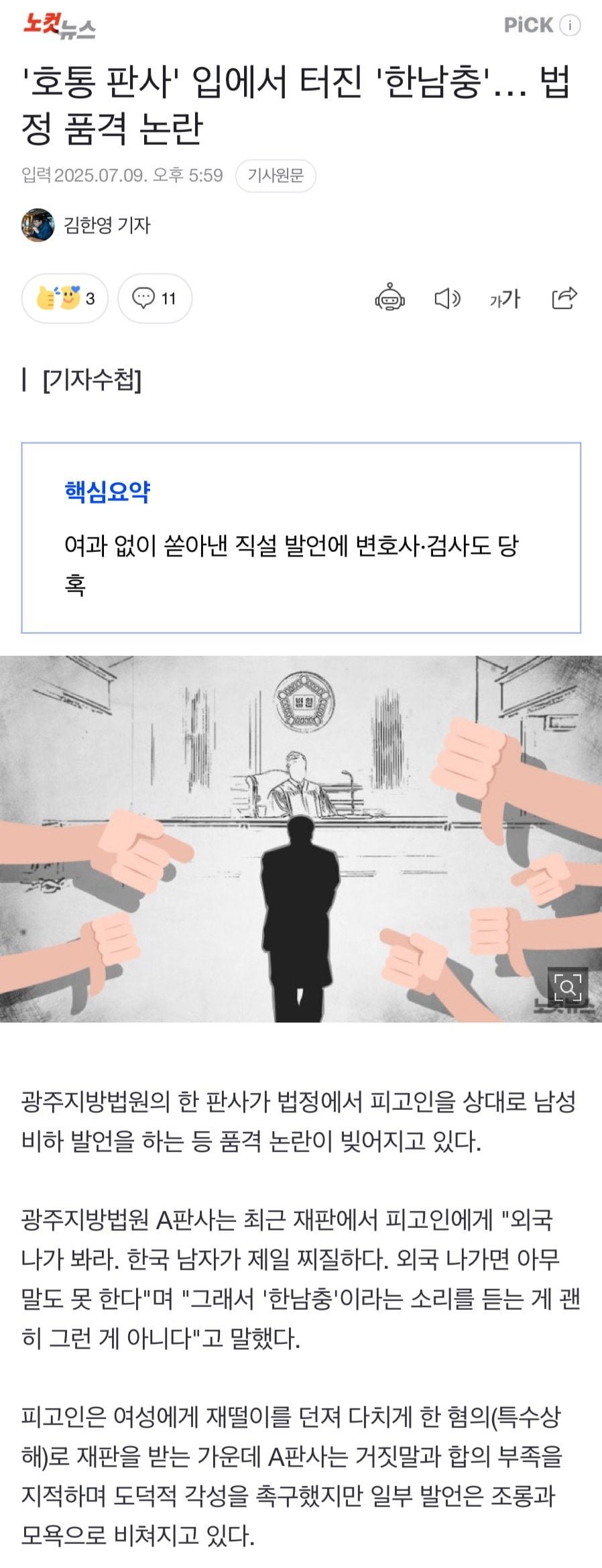 최근 광주지방법원에서 벌어진 충격적인 사건이 화제를 모으고 있다. 한 판사가 법정에서 피고인에게 남성 비하 발언을 쏟아내며 품격 논란이 일고 있는 것. 이 사건의 주인공인 A판사는 피고인에게 "외국 나가 봐라. 한국 남자가 제일 찌질하다"며 경악스러운 발언을 던졌다. 이어 그는 "그래서 '한남충'이라는 소리를 듣는 게 괜히 그런 게 아니다"라고 덧붙였다.
