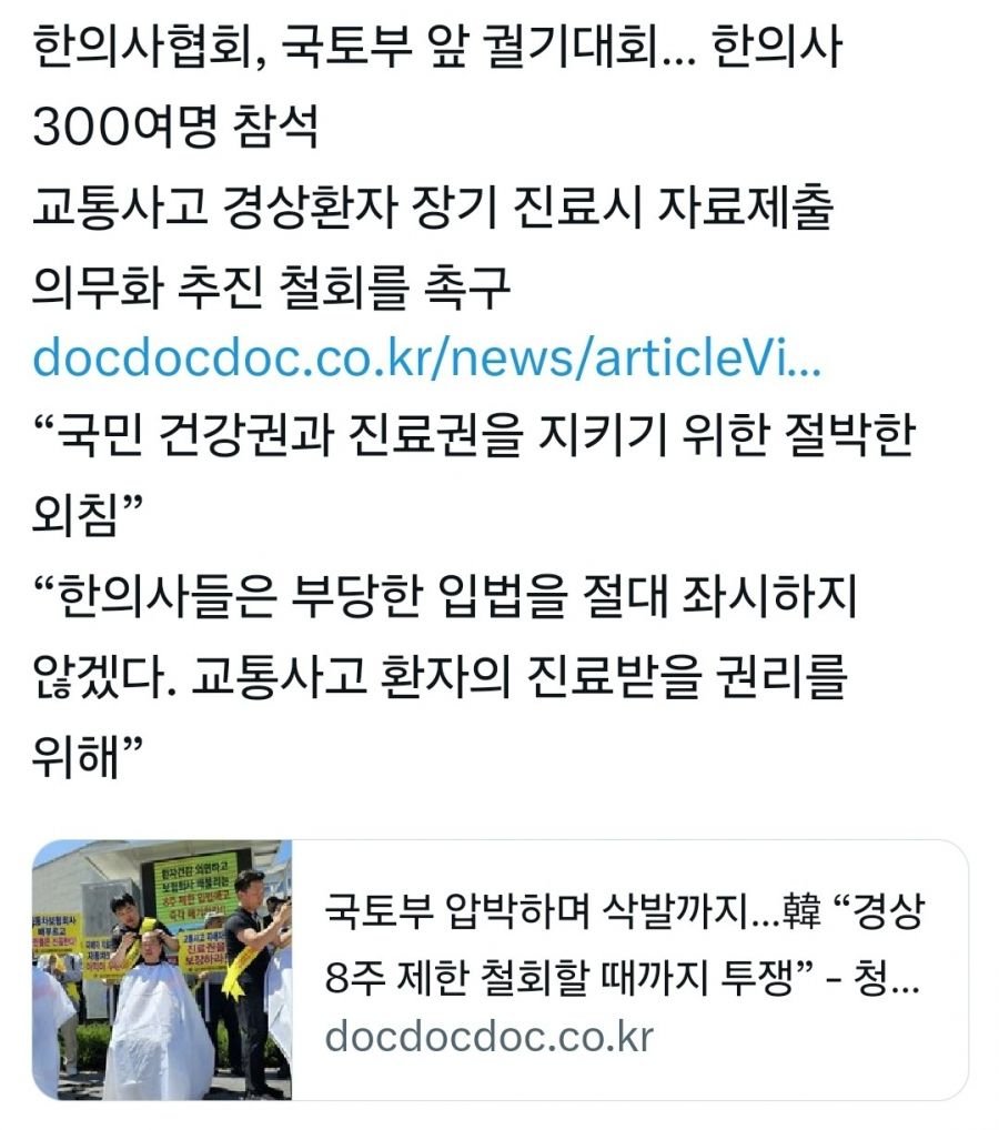 한의사협회가 심각한 위기 속에 놓였다. 그들은 최근 국토부 앞에서 300여명의 한의사들이 모여 결사반대 궐기대회를 열고, 교통사고 경상환자의 장기 진료 시 자료 제출 의무화를 철회할 것을 강력히 촉구했다. 이들은 “국민 건강권과 진료권을 지키기 위한 절박한 외침”이라며, 자신들의 권리를 지키기 위해 끝까지 싸울 것이라고 다짐했다.