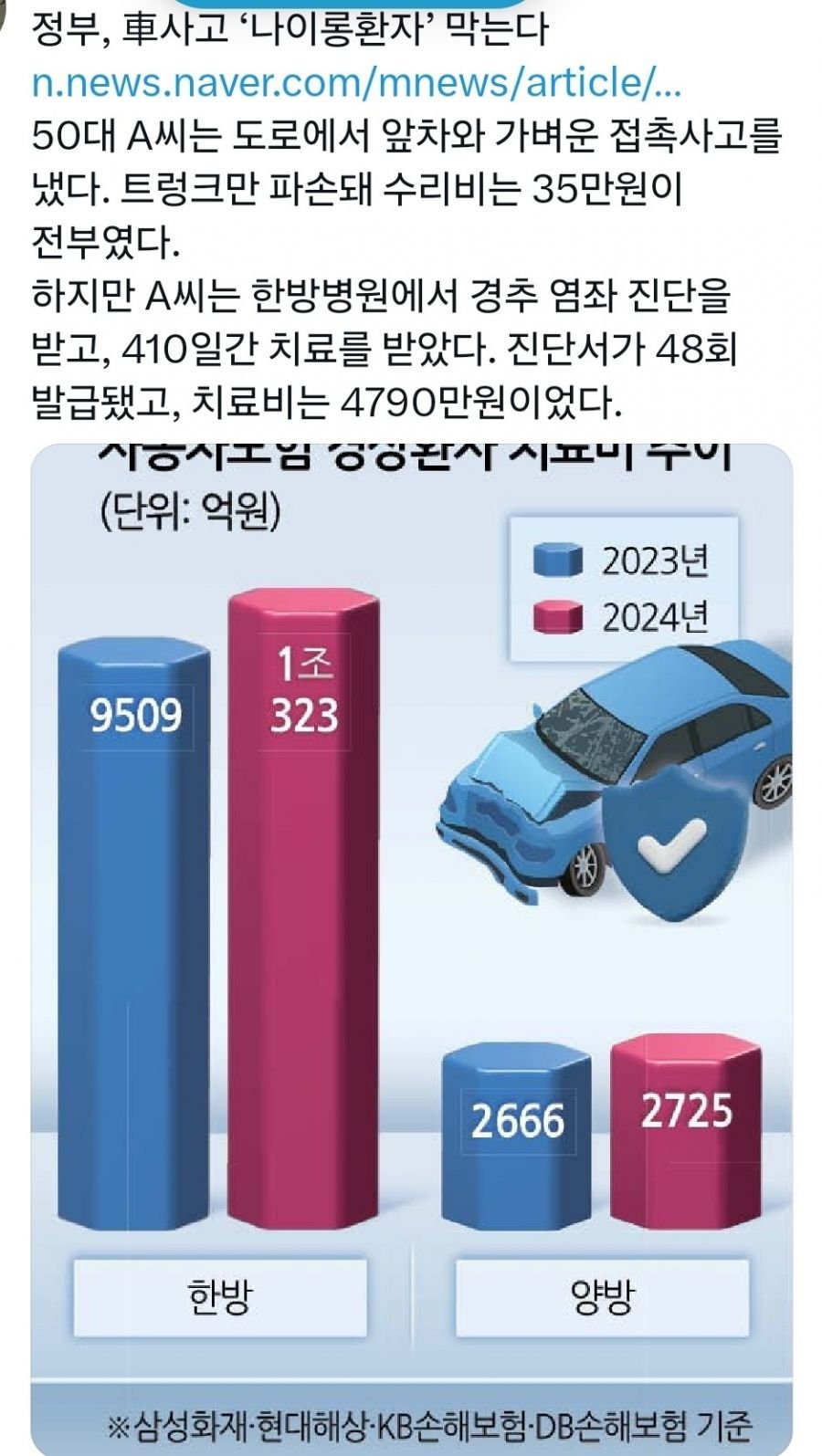 한편, 50대 남성 A씨의 사례는 더욱 충격적이다. 그는 가벼운 접촉사고로 단지 트렁크가 손상된 후, 한방병원에서의 치료로 무려 410일간의 긴 기간을 소요하며 4790만원의 치료비를 청구 받은 사건이 화제다. 이를 통해 국토부는 '나이롱환자'에 대한 문제를 해결하기 위한 강력한 조치를 예고하고 있다.